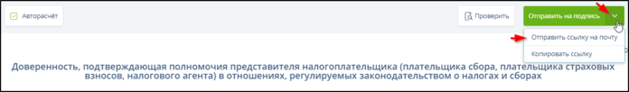 2. Заполнив и сохранив документ, Представитель передаёт ссылку на документ для подписи, отправив ссылку на почту или скопировав её для отправки любым другим удобным ему способом Доверителю, который может не быть абонентом ООО "Такском", но должен иметь действительный квалифицированный ключ ЭП.