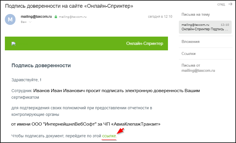 3. Доверитель получает ссылку. Пример письма от представителя: