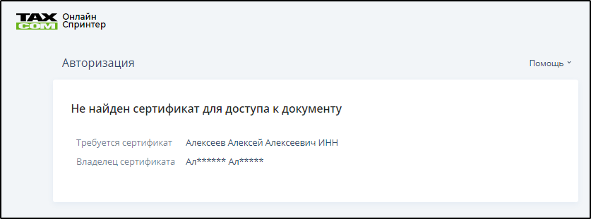 После настройки рабочего места автоматически происходит подходящих для входа сертификатов, если настройка не выполнена или действительный личный сертификат ключа ЭП не установлен, то отображается сообщение "Не найден сертификат для доступа к документу". Пример: