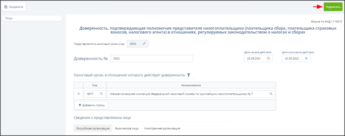 10. Представитель отправляет Доверенность в ИФНС нажатием кнопки