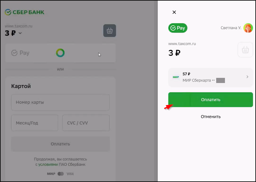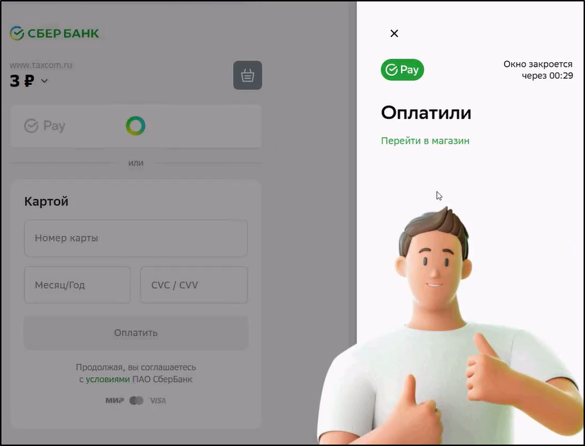 6. В открывшемся окне ввести данные для оплаты и нажать кнопку . Пример: