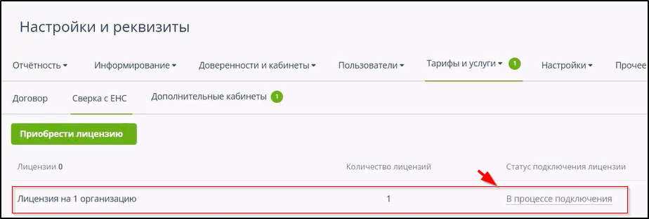 Отправленная заявка отобразится в списке лицензий на сверку с ЕНС. Сначала её статус будет "В процессе подключения". Пример: