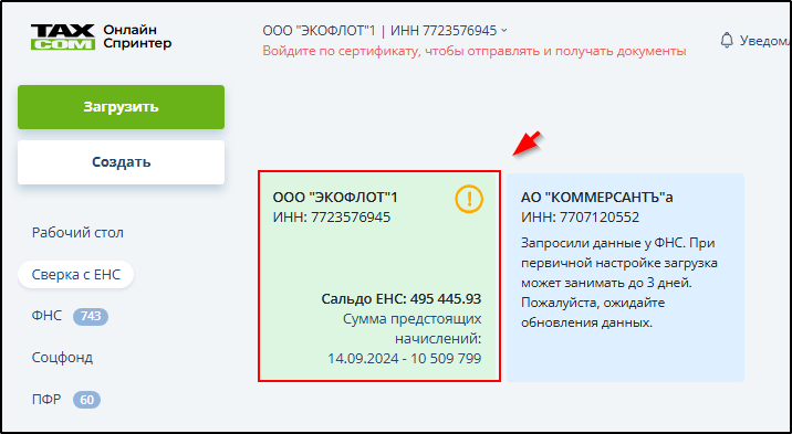 8.1.9, информация о сальдо и дате предстоящих начислений ФНС отобразится в разделе "Сверка с ЕНС" главного меню на отдельном блоке для каждой организации и ИП.