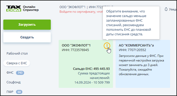 "Обратите внимание, что значение сальдо меньше запланированных ФНС списаний, рекомендуем пополнить ЕНС до плановой даты списания средств."