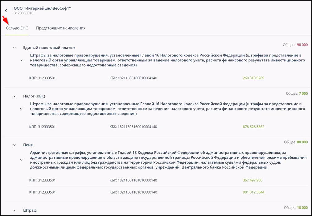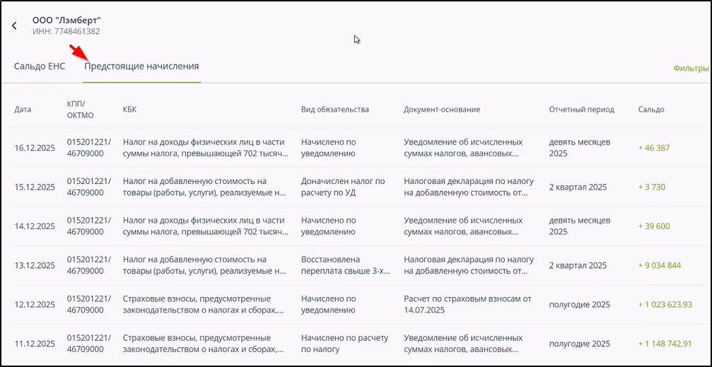 В результате этого отобразится вкладка с двумя подразделами - "Сальдо ЕНС" и "Предстоящие начисления".