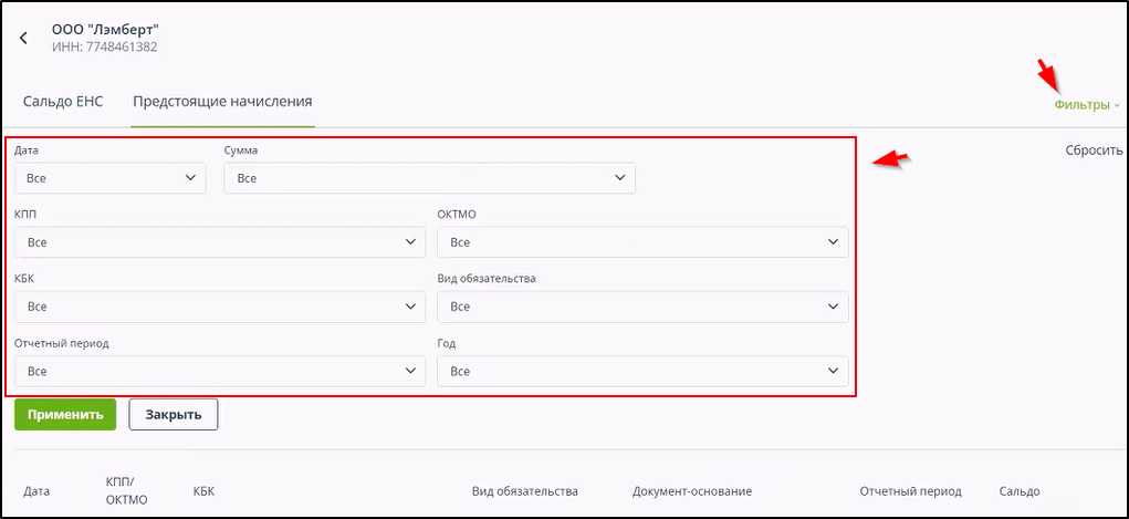 Если нажать кнопку "Фильтры" на вкладке "Предстоящие начисления", то в открывшихся полях можно выбрать параметры фильтрации (дату, сумму, КПП, ОКТМО, КБК, вид обязательства, отчётный период, год):