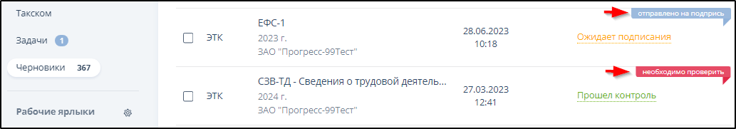 Раздел "Черновики" содержит файлы комплектов документов и отдельных документов на стадии редактирования и подготовки к отправке. (См. п. 8.2.2 "Работа с неотправленным документом".)