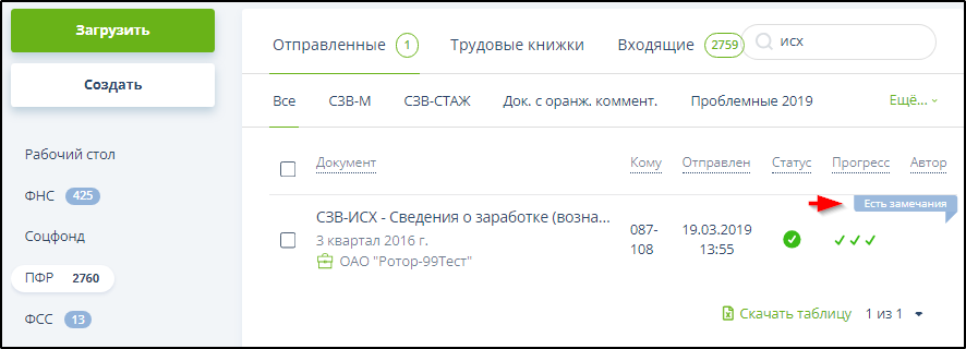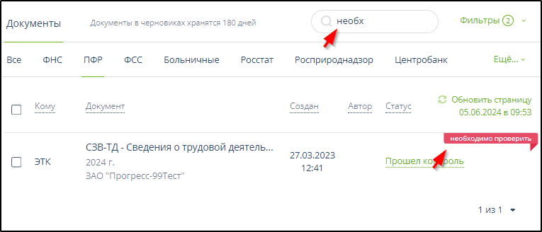 Раздел "ПФР" содержит данные об отправленных документах и используется для контроля выполнения регламента ЭДО после отправки документа или комплекта документов в органы ПФР.