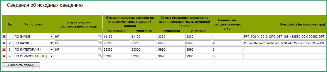 Далее необходимо добавить строки с типом «ПО КАТЕГОРИИ». Количество этих строк должно соответствовать количеству различных кодов категорий застрахованного лица, указанных в пачках, т.е. для каждой категории необходимо добавить отдельную строку с соответствующим кодом. В этих строках необходимо заполнить все поля, за исключением имени файла. Поля колонок "Сумма страховых взносов..." и "Количество застрахованныхлиц" должны содержать суммы по строкам с типом «ПО ПАЧКЕ» с соответствующим кодом категории застрахованного лица.