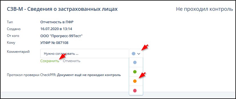 Ввести комментарий, при желании - выбрать цвет значка комментария в списке документов. Пример: