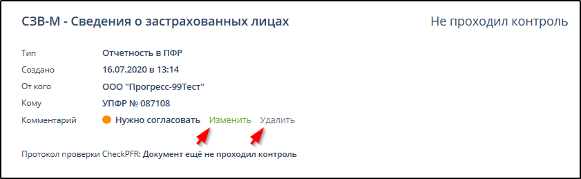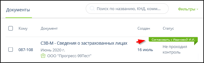 Каждому сформированному документу (комплекту документов) соответствует строка таблицы, содержащая: код получателя, тип отчётности, тип документа, дату создания (импортирования), сведения о проверке на соответствие установленному формату (статус).