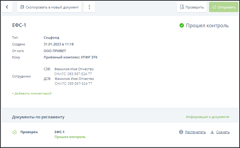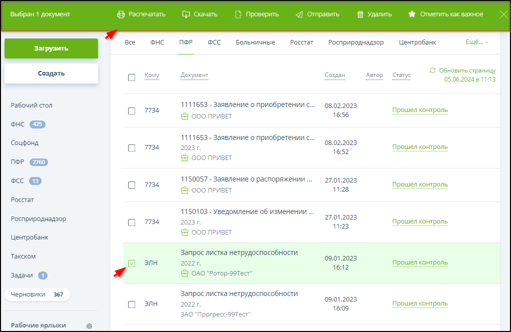 Для выполнения команд панели инструментов ("Распечатать", "Скачать", "Проверить", "Отправить", "Удалить", "Отметить как важное") нужно установить галочки слева от документов, для которых следует выполнить действие. Скачать незаполненный бланк документа нельзя.