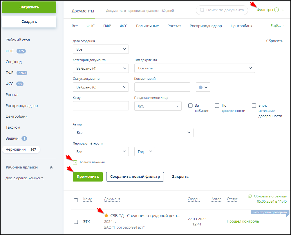 Можно установить параметры фильтрации: "Дата создания", "Категория документа", "Тип документа", "Статус документа", "Комментарий", "Кому" (Получатель), "Представляемое лицо", "За кабинет", "По доверенности", "Автор", "Период отчетности", "Год", "Только важные". После установки необходимых параметров для их применения следует нажать кнопку Применить .