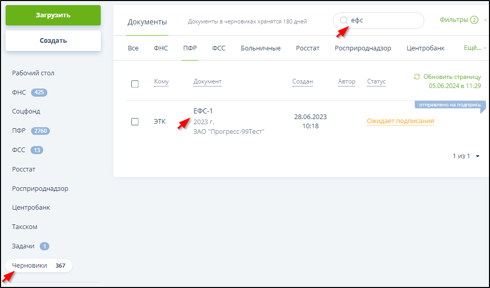 Если по какой-либо причине работу по подготовке документа нужно приостановить, пользователь может сохранить черновик документа в разделе "Черновики" и возобновить работу с этим документом позже. Документ может храниться в разделе "Черновики" до 180 дней.
