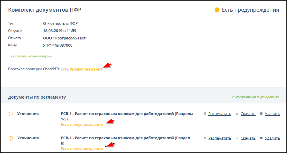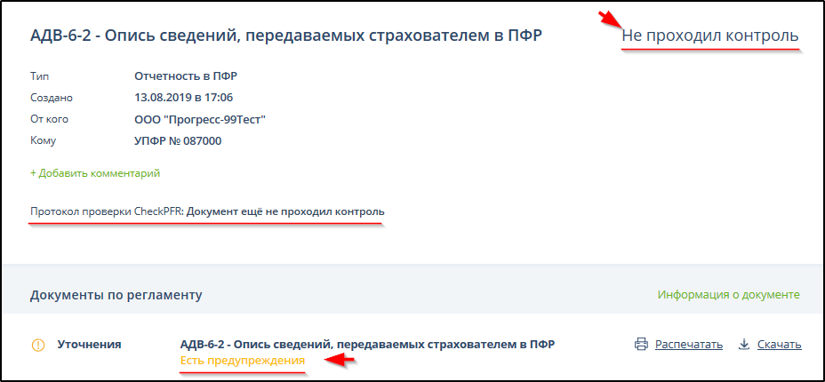 Выходной контроль документов ПФР состоит из двух этапов, выполняемых разными программными средствами, поэтому результат полной проверки одного документа представляется двумя разными протоколами. Утверждение об отсутствии выявленных ошибок и предупреждений в одном из протоколов не гарантирует отсутствие выявленных ошибок и предупреждений в другом протоколе, необходимо ознакомиться со всеми протоколами.