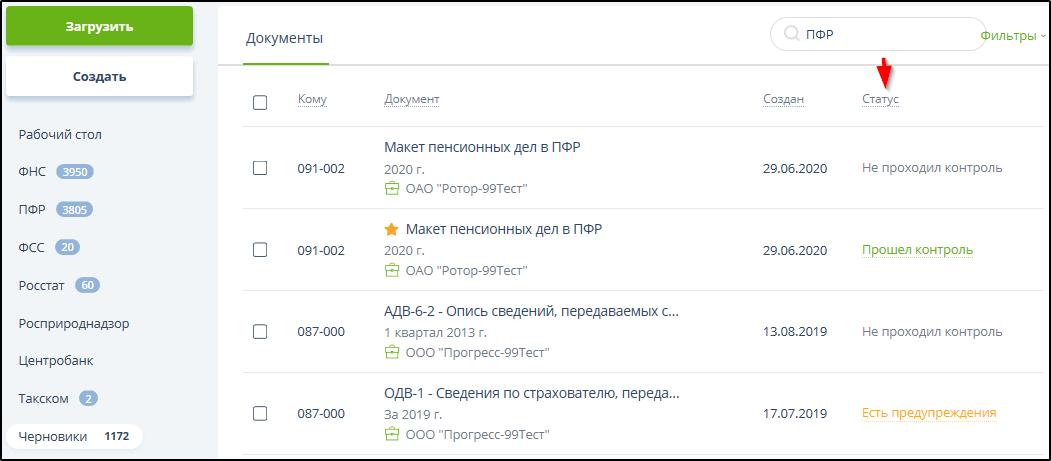 Результат проверки отображается в колонке "Статус" таблицы черновиков документов. Пример: