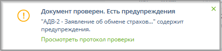 Результат такой проверки не отображается в колонке "Статус" таблицы черновиков документов и не меняет статус "Не проходил контроль" документа, но его можно получить, если нажать ссылку "Есть предупреждения" ниже заголовка "Документы по регламенту" на странице комплекта документов. Пример: