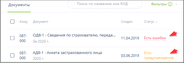 При обнаружении ошибок в отправляемом документе в колонке "Статус" или рядом с его наименованием (в зависимости от открытой страницы) для этого документа (комплекта документов) отображается ссылка "Есть ошибки" или "Есть предупреждения". Для ознакомления с ошибками следует перейти по этим ссылкам. Примеры: