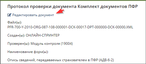 Для исправления документа, если реализована его визуализация в ПО Онлайн-Спринтер, на странице отображения протокола можно воспользоваться ссылкой "Редактировать документ". Пример: