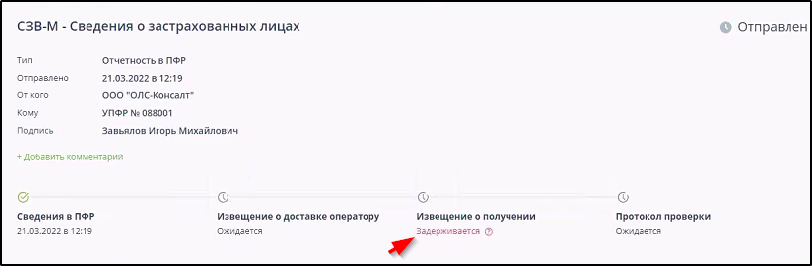 В случае временного отсутствия доступа к серверам ПФР и задержке какого-либо ответного сообщения на странице информации об ЭДО появится сообщение "Задерживается". В таких случаях повторно отправлять отчётность не нужно. Пример: