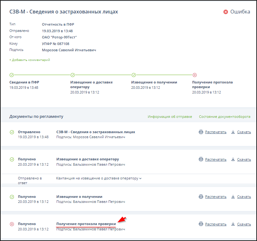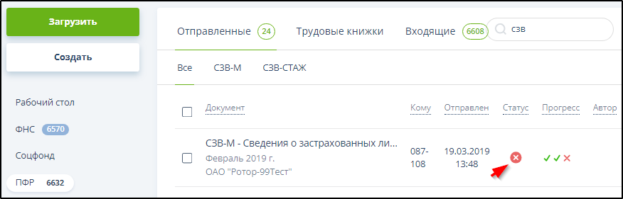 Если в полученном протоколе проверки содержится информация о том, что сведения о застрахованных лицах содержат ошибки, или получено извещение об отказе в приеме, то в поле "Статус" отображается значок