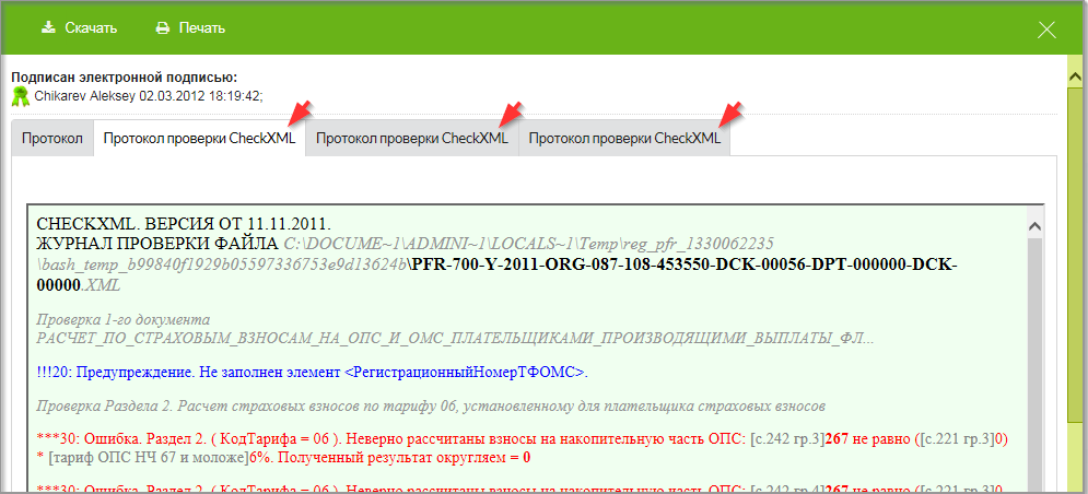 В последнем случае конкретная информация об ошибках содержится на закладках "Протокол проверки CheckXML":