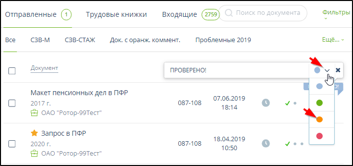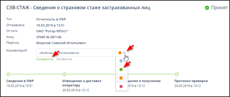 Для документооборота отчётности ПФР значки в колонке "Статус" имеют следующий смысл: