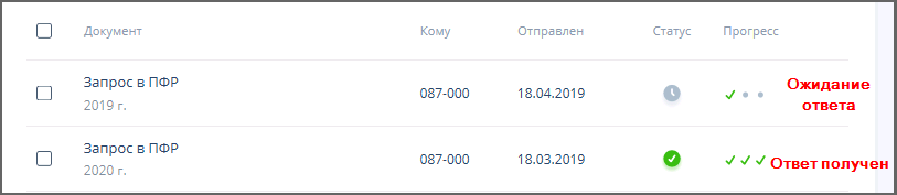 Если в строке информации о запросе в графе "Прогресс" третий (крайний справа) значок - серая точка, то ответ не получен, если в этой позиции зеленая галочка, - ответ получен. Примеры: