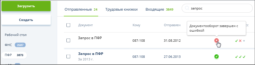 Для получения из ПФР ответа на формализованный запрос нужно войти в систему по ключу ЭП (см.п. 5.1. Доступ по ключу ЭП) и открыть подраздел "Отправленные" раздела "ПФР".