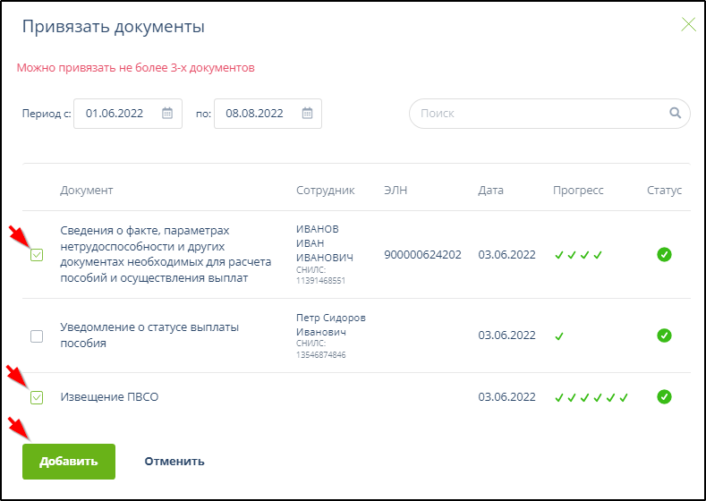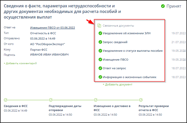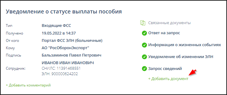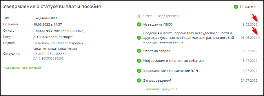 Отправленные данные страхователя по листку нетрудоспособности автоматически присоединяются к ЭДО запроса листка нетрудоспособности, содержащего те же номер больничного листа и СНИЛС, если такой ЭДО присутствует в системе.