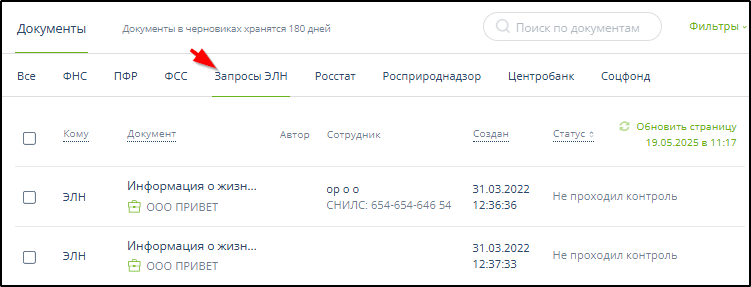В подразделе "Запросы ЭЛН" раздела "Черновики" можно найти сохраненные черновики следующих документов: