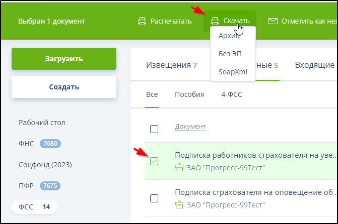 Для выбора варианта скачивания нужно отметить документы галочками и выбрать вариант скачивания в меню