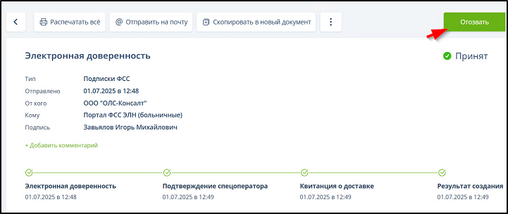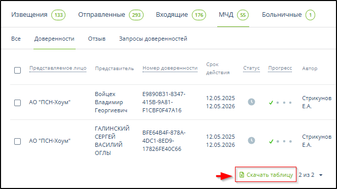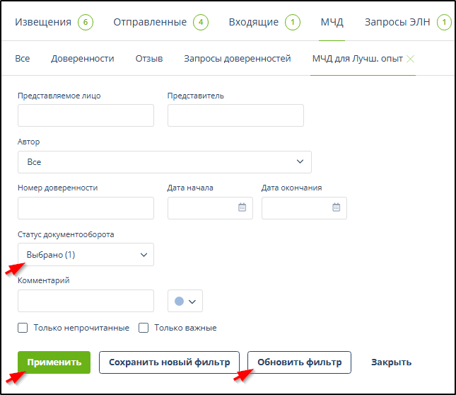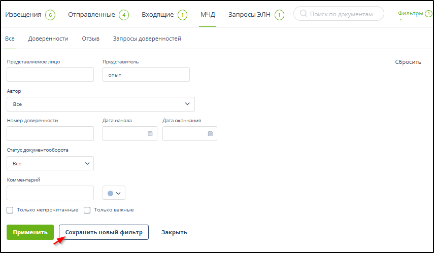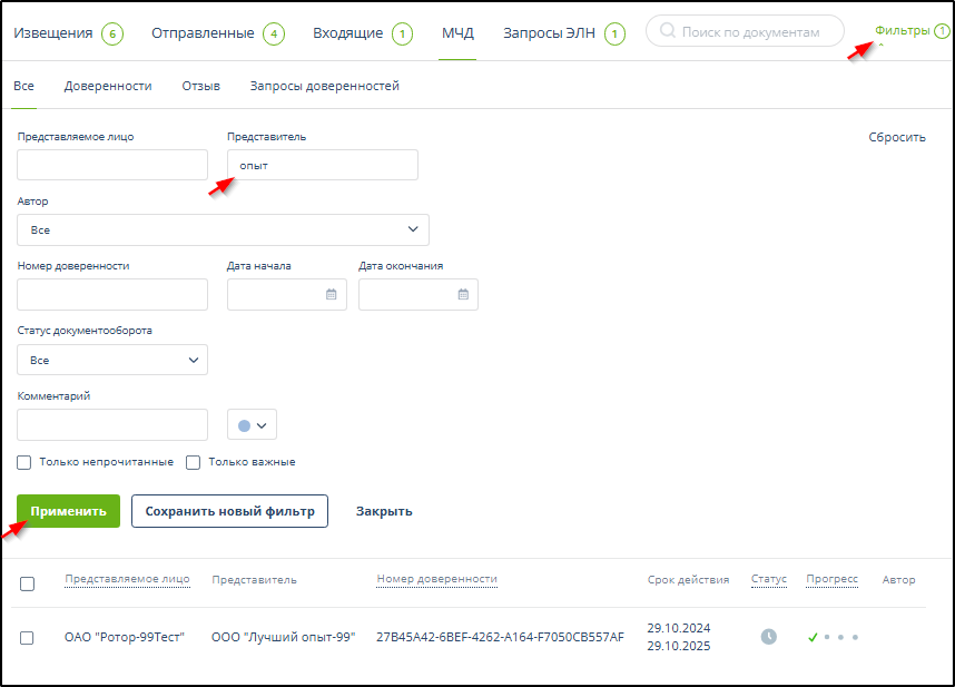 Поиск и фильтрация отправленных на регистрацию доверенностей