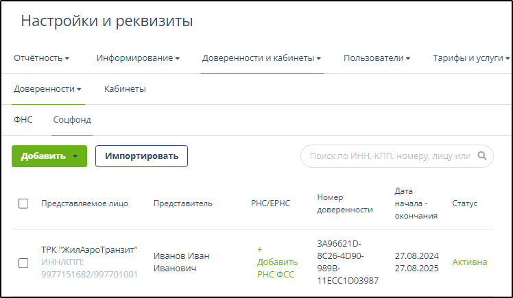 Для поиска доверенности можно ввести в поле поиска полностью или частично наименование организации представляемого лица, ФИО его представителя или номер доверенности.