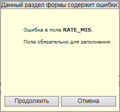При сохранении документа, переходе на новую страницу документа или при переходе к контролю будет осуществлена проверка заполнения обязательных полей (только для текущего раздела, листа, страницы), проверка правильности указания значений кодов и сверка значений реквизитов, указанных в данной форме, со значениями реквизитов в разделе "Настройки". В случае обнаружения ошибок, появится окно "Данный раздел формы содержит ошибки" со списком допущенных в текущем разделе ошибок. Пример: