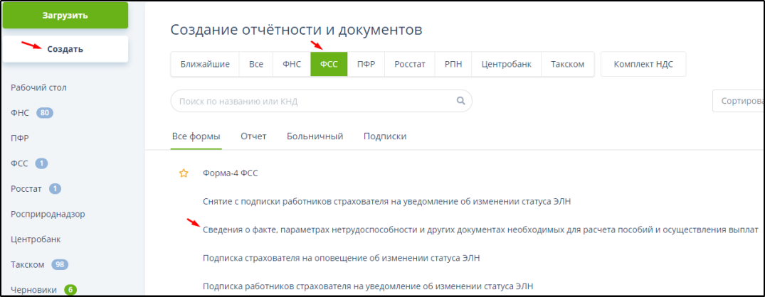 • Нажать «Создать» – «ФСС» - «Сведения о факте, параметрах нетрудоспособности и других документах, необходимых для расчета пособий и осуществления выплат». Пример: