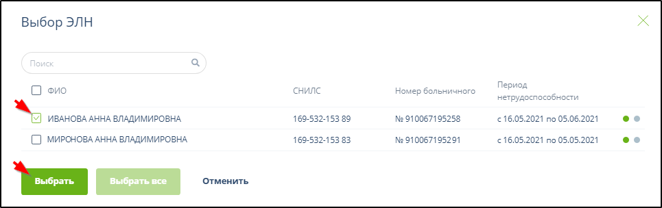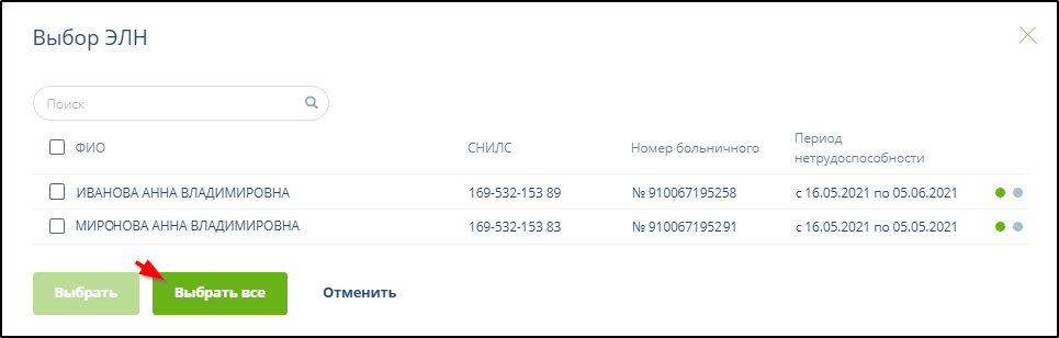 Отметить необходимые ЭЛН галочками и нажать кнопку Выбрать или нажать кнопку Выбрать всё , если нужно использовать в реестре информацию всех отображаемых ЭЛН. Примеры: