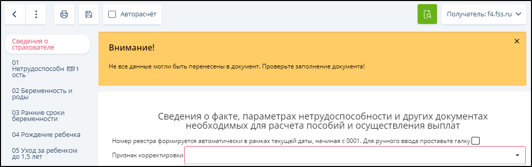 После этого откроется для заполнения реестр "Cведения о факте, параметрах нетрудоспособности и других документах, необходимых для расчета пособий и осуществления выплат", в который перенесены данные из выбранных ЭЛН. Пример: