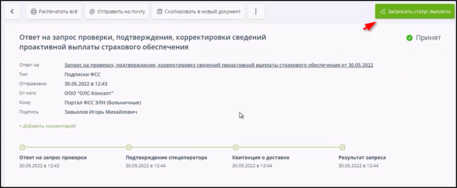 Для формирования Запроса статуса выплаты на основе Ответа на запрос проверки, подтверждения, корректировки сведений проактивной выплаты страхового обеспечения с сохранением связи между этими документами нужно открыть документооборот Ответа на запрос проверки, подтверждения, корректировки сведений проактивной выплаты страхового обеспечения и нажать соответствующую кнопку справа вверху окна.