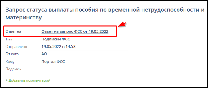 В формируемом Запросе при использовании кнопки "Запросить статус выплаты" будет записана ссылка на использованный при формировании Ответ на запрос проверки, подтверждения, корректировки сведений проактивной выплаты страхового обеспечения.
