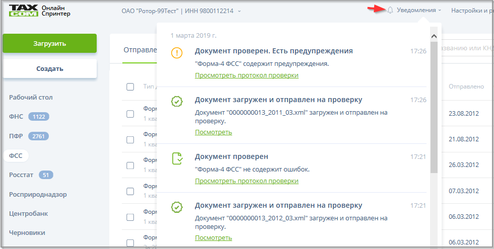 Результат загрузки и проверки также отображается в Журнале уведомлений, который можно открыть нажатием кнопки "Уведомления" в верхней части окна. Пример: