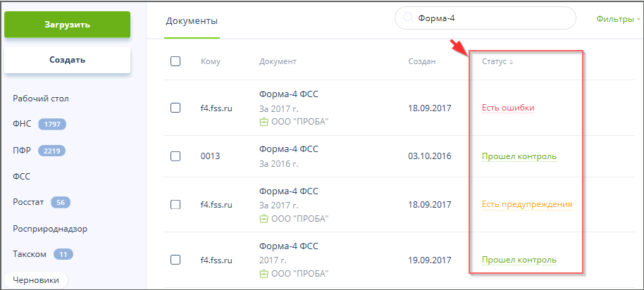 Документы, не прошедшие выходной контроль, не могут быть отправлены в ФСС.