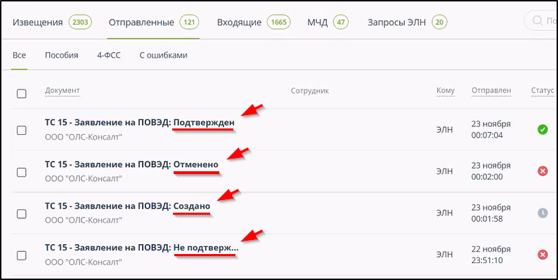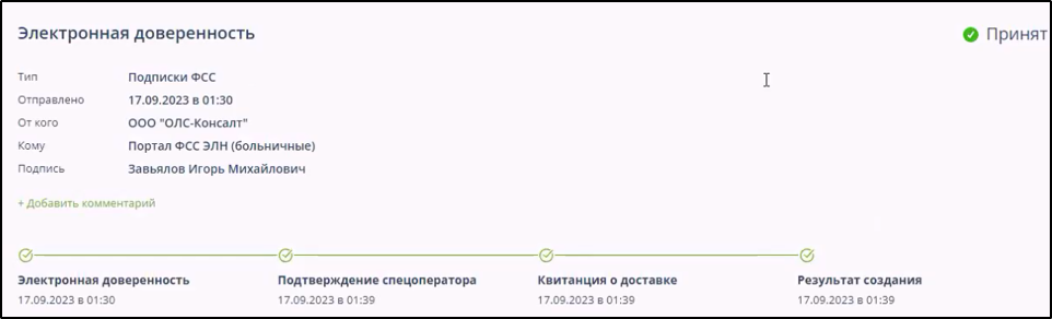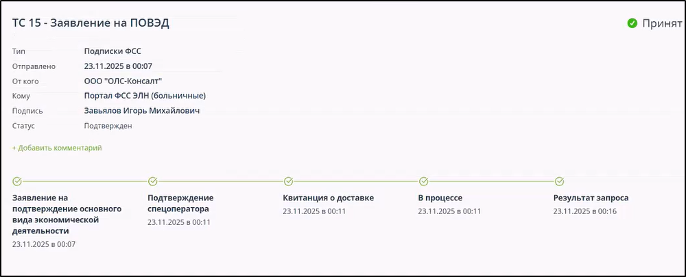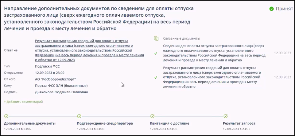 - Запрос на предоставление/прием данных страхователя по больничному листку или подписку на оповещение отклонён ФСС.