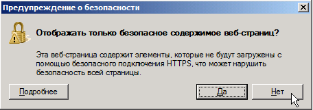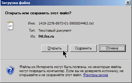 Для ознакомления с результатом отправки документа в ФСС следует перейти по ссылке с названием последнего полученного сообщения, например, "Результат проверки отчета в ФСС" или "Результат запроса". Возможно откроется окно "Предупреждение о безопасности":