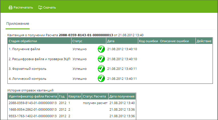 При наличии положительного Протокола проверки и Квитанции о получении расчета откроется окно следующего вида.