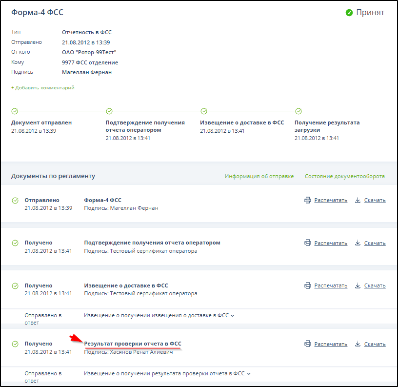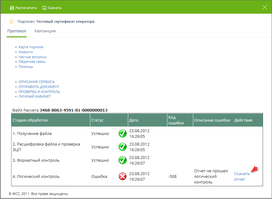 ПРИМЕЧАНИЕ. В случае если по каким-либо причинам страхователь не получил в установленное время (48 часов от момента доставки отчета в ФСС) Результат проверки отчета в ФСС, но получил от Оператора Извещение о доставке в ФСС, страхователь может воспользоваться сервисом на единой точке приема ФСС http://f4.fss.ru. Информация о квитанции доступна на страницах сервиса "Проверка и контроль" http://f4.fss.ru/fss/status или "Личный кабинет" http://f4.fss.ru/fss/office.