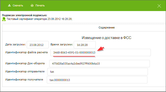 Идентификатор файла расчета при необходимости можно просмотреть и скопировать, например, перейдя по ссылке "Извещение о доставке в ФСС". Пример отображения Идентификатора файла расчета: