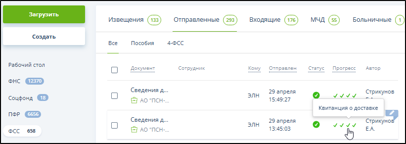 Для осуществления контроля представления отчётности нужно открыть подраздел "Отправленные" раздела "ФСС".