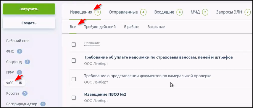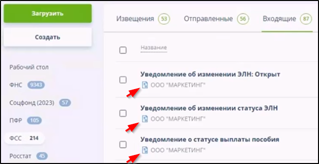 Информация обо всех поступивших от ФСС извещениях отображается в подразделе "ФСС" - "Извещения" - "Все". Пример: