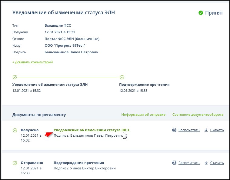 Полученный документ и весь документооборот можно скачать, распечатать или отправить электронной почтой при помощи ссылок